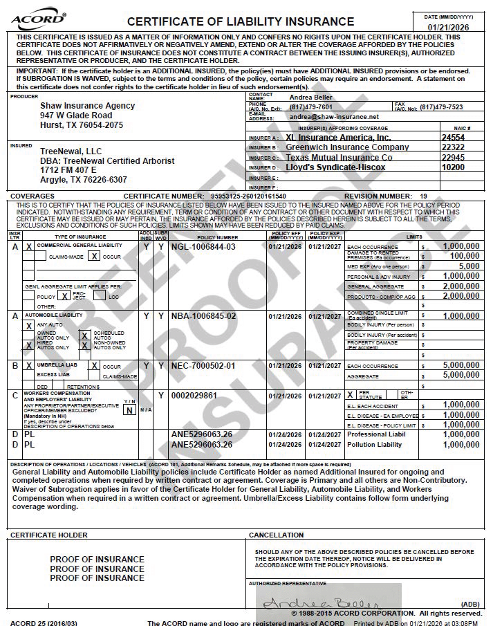TreeNewal works for the most discerning commercial and residential customers, and our clients take comfort in knowing that we would never do a job without being adequately insured.
